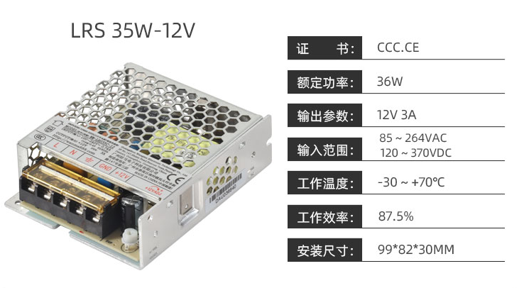 12V開關(guān)電源LRS35W產(chǎn)品概述: 具有成本低、體積小,電源采用電壓設(shè)計(jì),穩(wěn)定可靠等優(yōu)點(diǎn)。單端反激隔離式開關(guān)電源,安全可靠。 1.體積小,30mm厚度低外型 2.具有輸出短路、過流、過壓、過溫保護(hù)功能 3.可承受300VAC輸入浪涌電壓5s 4.可承受5G振動(dòng)測(cè)試 5.低待機(jī)功耗(<0.3W)、高效率(高達(dá)91.5%) 6.電源啟動(dòng)LED指示燈 7.內(nèi)置直流風(fēng)扇強(qiáng)制風(fēng)冷(350W) 8.CE、CCC、CQC認(rèn)證(200W/350W) 9.三年保固