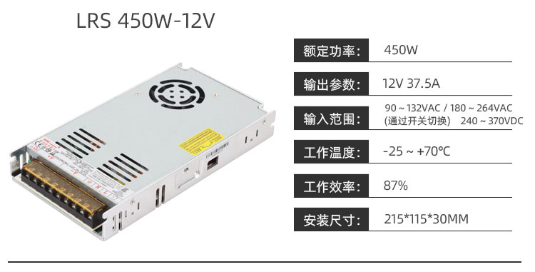 LRS450W系列專用電源特性:交流輸入范圍通過開關(guān)切換,可承受300VAC浪涌輸入5秒,保護(hù)種類:短路/過負(fù)載/過電壓/過溫度,內(nèi)置直流風(fēng)扇強(qiáng)制風(fēng)冷,具有冷卻風(fēng)扇開/關(guān)控制,超小體積1U低外型,可承受5G振動(dòng)測(cè)試,100%滿載老化測(cè)試,LED 電源指示,工作溫度可達(dá)70℃,低成本,高效率,高壽命和高可靠度,3年保固