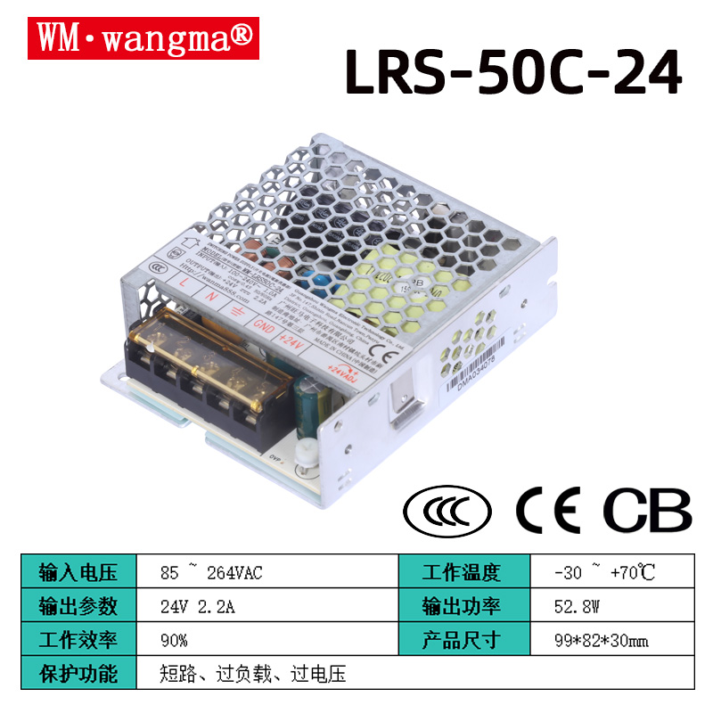 額定功率 50W,單路穩(wěn)壓輸出;主流型號(hào):LRS50C-12(12V/4.2A,電壓可調(diào) 10.2–13.8V)、LRS50C-24(24V/2.1A,可調(diào) 21.6–26.4V);紋波低(≤50mVp-p),適合精密負(fù)載。