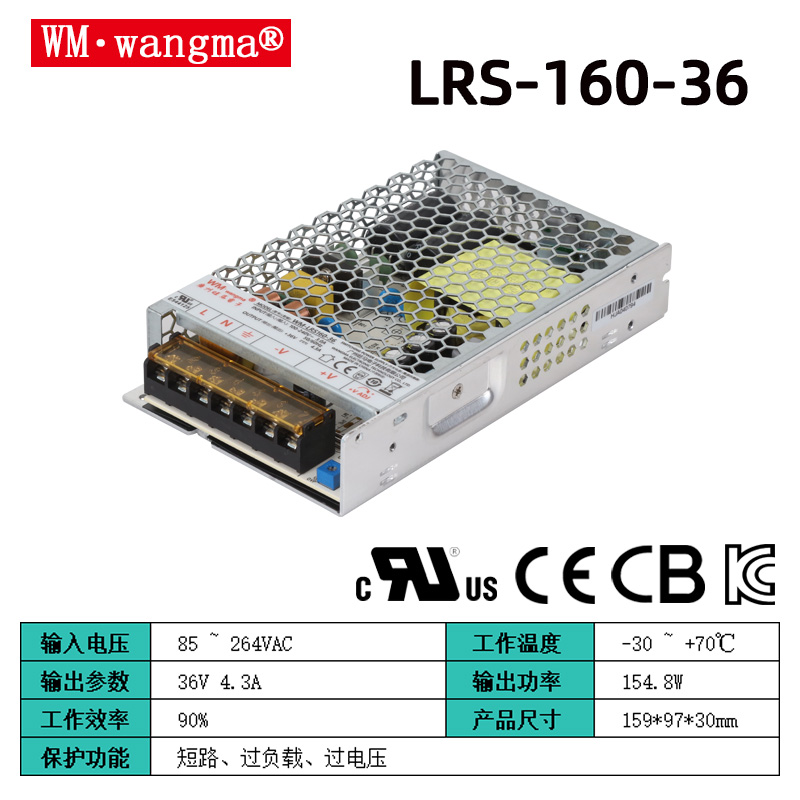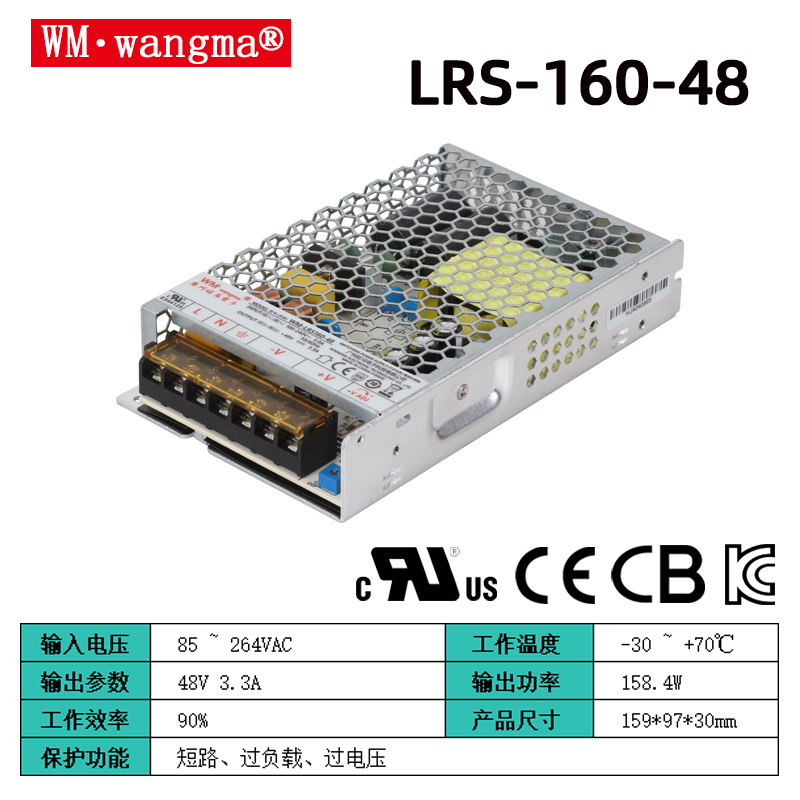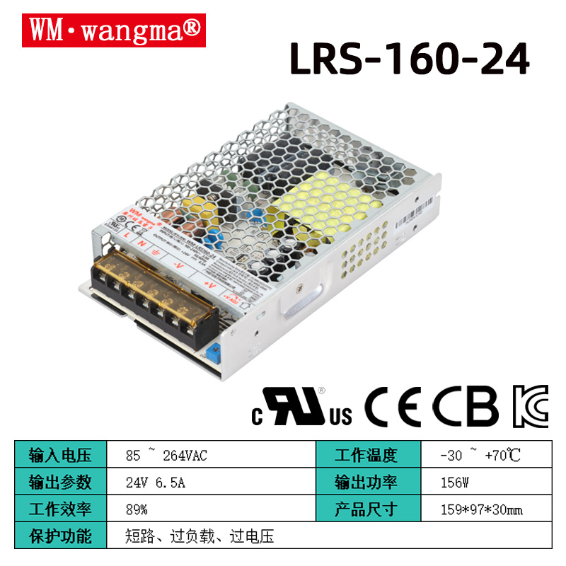 主流型號:WM-LRS160-12開關(guān)電源(12V,13.3A)、WM-LRS160-24開關(guān)電源(24V,6.67A)、WM-LRS160-36開關(guān)電源(36V,4.44A)、WM-LRS160-48開關(guān)電源(48V,3.33A)